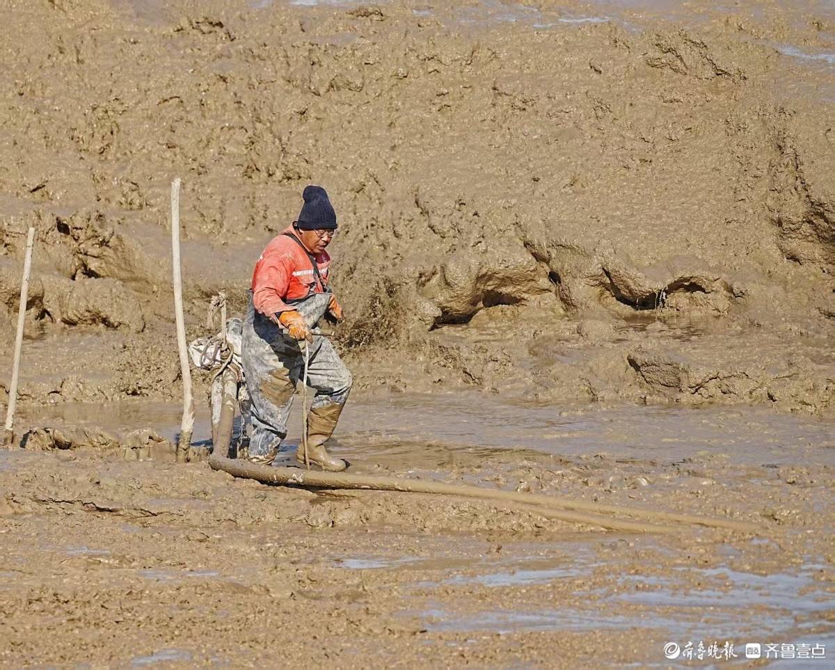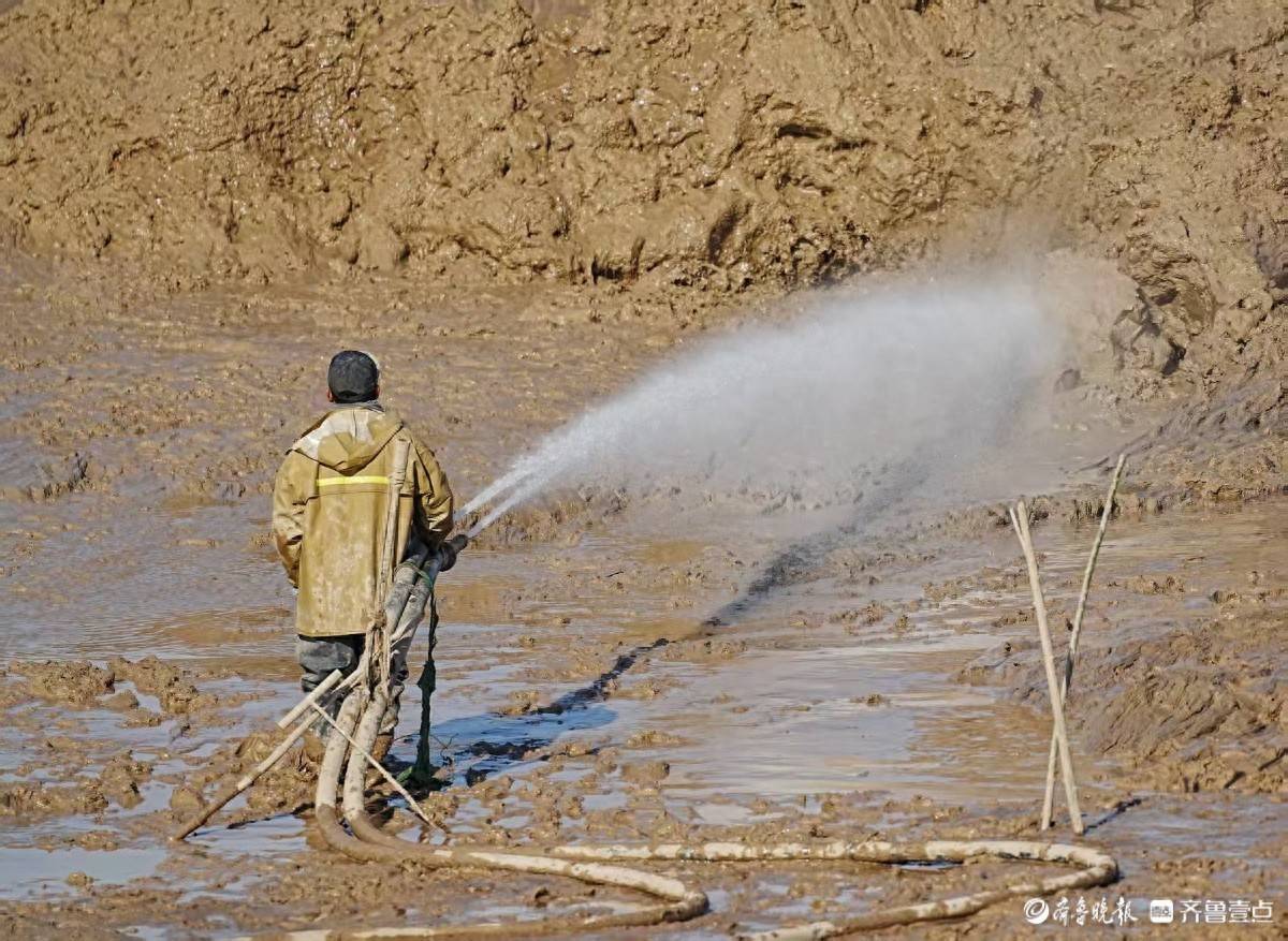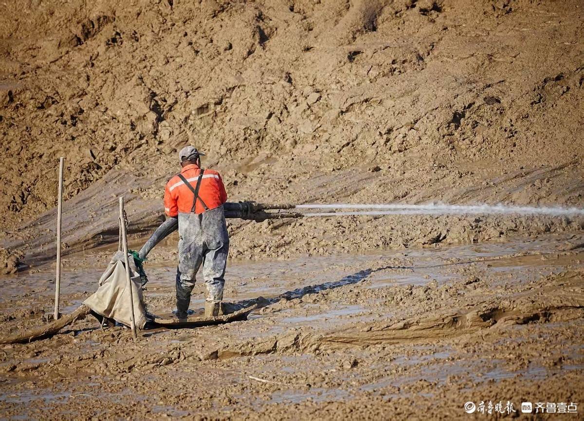 深资管配资官网 济南鹊山水库沉沙池,吹池清淤的工人