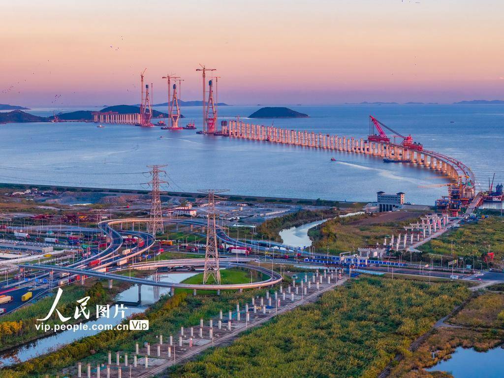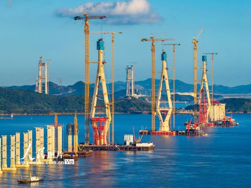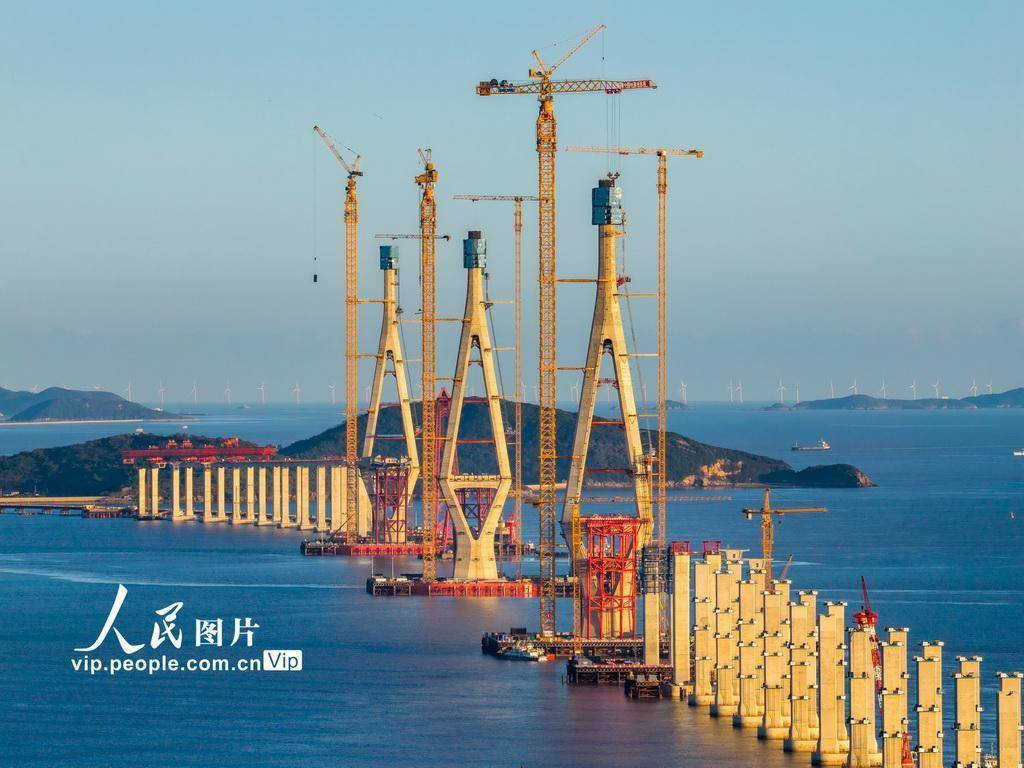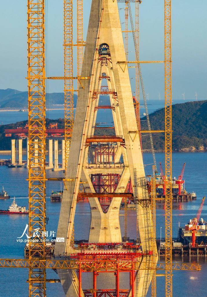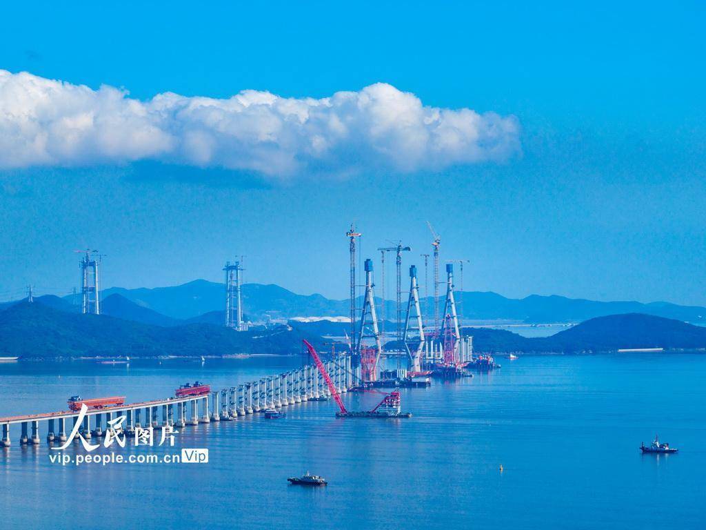 青龙门特大桥,作为宁波舟山港六横公路大桥二期项目核心控制性工程之一,横跨青龙门水道,全长2212米,主跨2×756米,连接舟山市六横佛渡岛和宁波市北仑梅山岛。胡学军摄(人民图片网)